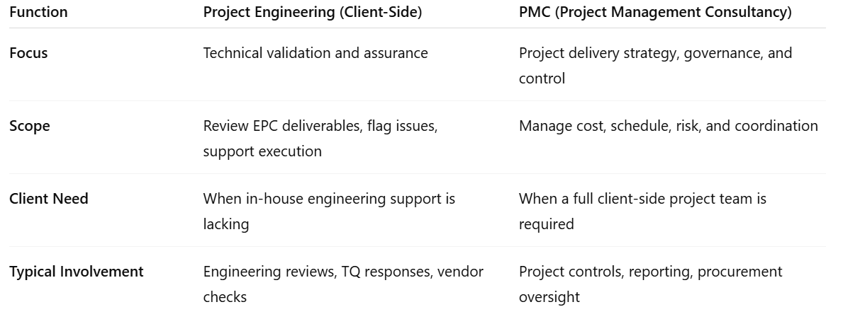 While PMC focuses on overall project management—including scheduling, cost control, and contractor oversight—our Project Engineering support is purely technical and works within or alongside the PMC structure.